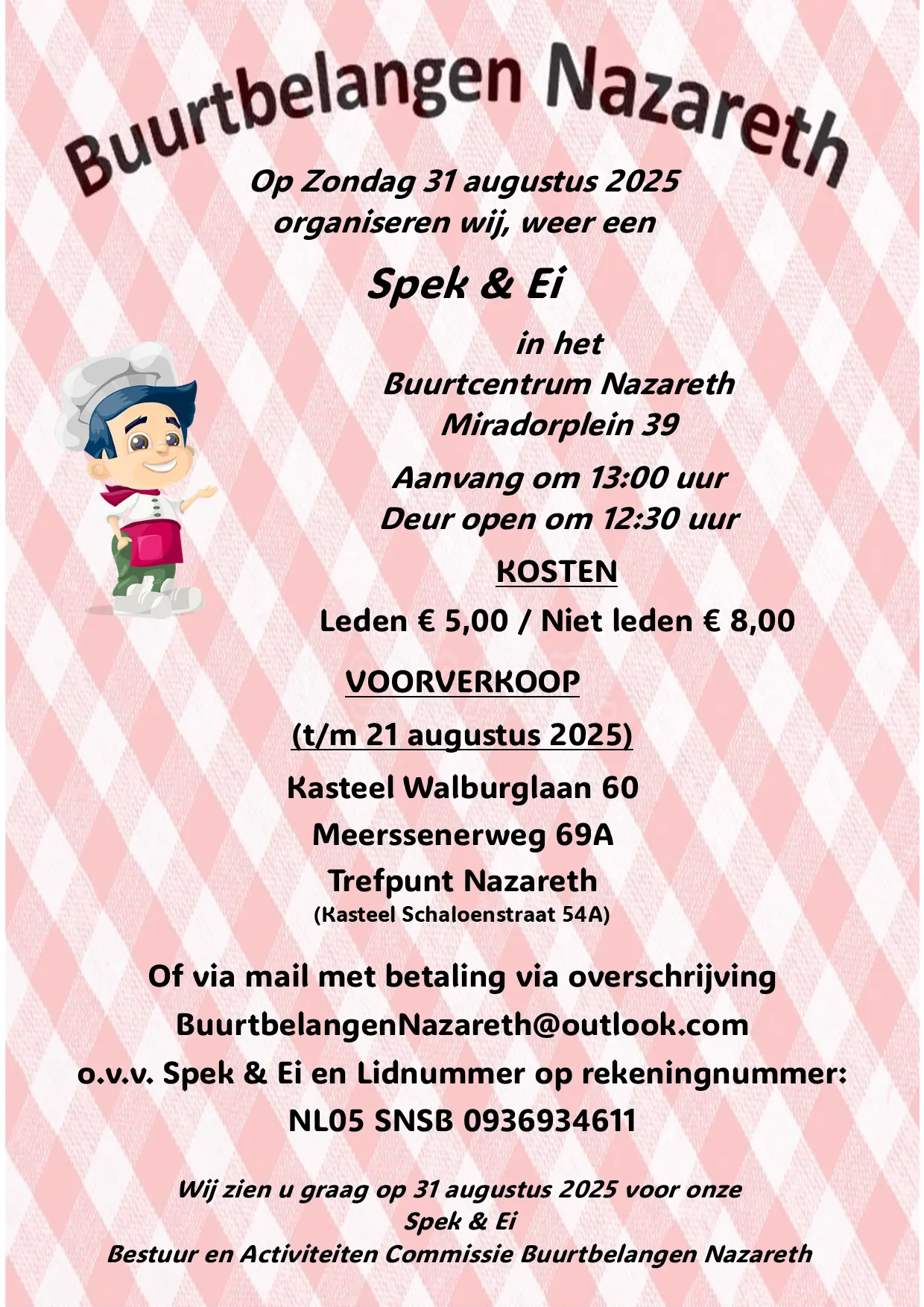 Op zondag 31 augustus organiseren wij, Buurtbelangen Nazareth, onze jaarlijkse Spek & Ei. Wij hopen dat u ook dit jaar van de partij bent. ...