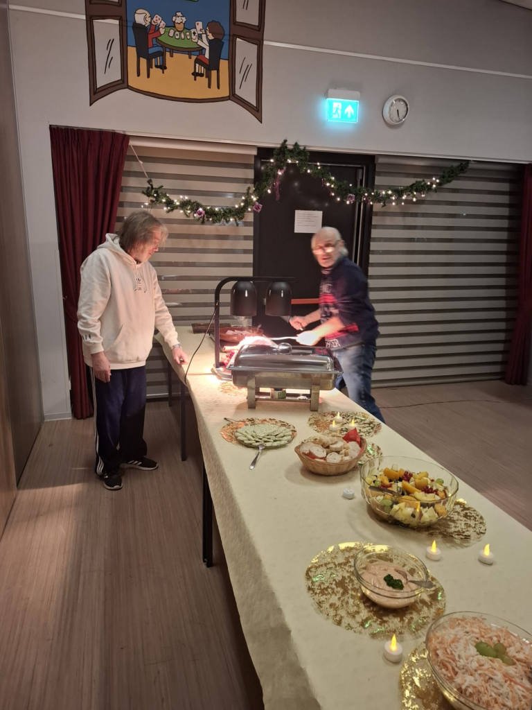 Daar genieten ze samen van een lekkere maaltijd die door vrijwilligers wordt bereid.
